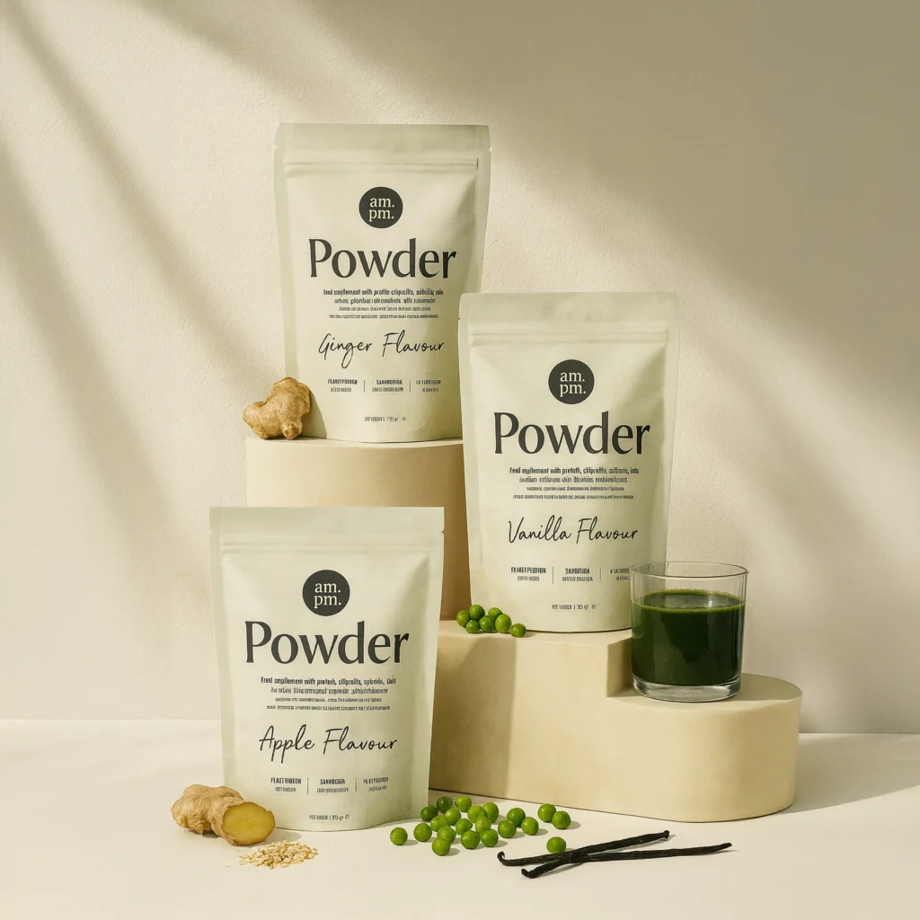 Am.pm. POWDER er designet til at erstatte flere kosttilskud ved at tilbyde en blanding af flere næringsstoffer i én skefuld om dagen. Det sigter mod at gøre det lettere at få dækket forskellige ernæringsbehov i én enkelt dosis.